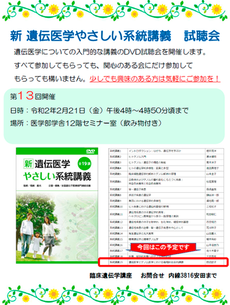2019年5月23日の旧版の系統講義DVD視聴から始まり、不定期で月数回行ってまいりました新 遺伝医学やさしい系統講義DVD試聴会ですが、2020年2月21日の第13回をもって新版全19講の視聴が終了しました! 学生さんはじめ多くの参加者の皆様、ありがとうございました。