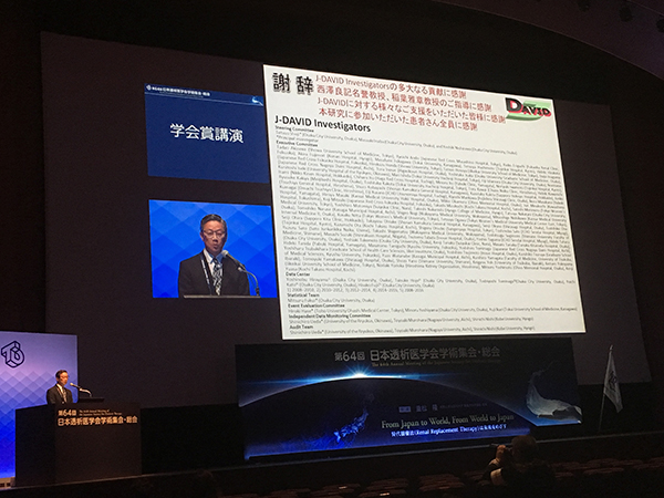 このように、J-DAVID試験は全国の多くの透析施設の医師、メディカルスタッフ、CRC、データセンター、イベント評価委員会、独立データモニタリング委員会、統計解析担当者、研究助成いただいた日本腎臓財団、財団に寄付をいただいた企業さま、それに何よりこの研究に参加して自らの情報を提供いただきました大勢の透析患者さんのおかげで成し遂げられたものです。筆頭著者である私が受賞させていただいてはおりますが、決して一人では達成できなかった偉業であり、代表して受賞させていただける光栄を重く受け止めております。関係者各位、および応援いただきました皆様に、心よりお礼申し上げます。