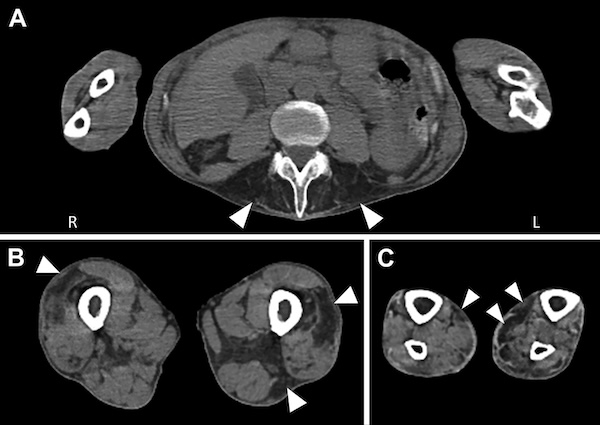 図. 骨格筋CT画像では、傍脊柱筋(A)、外側広筋、大内転筋、大腿二頭筋長頭(B)、腓腹筋内側頭(C)に脂肪変性を伴う筋萎縮を認める。