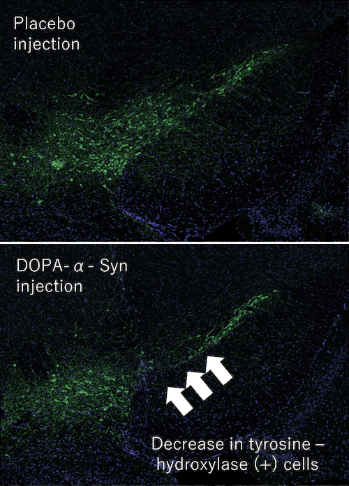 パーキンソン病は、αシヌクレインという蛋白質が神経細胞内に蓄積し発症すると考えられています。最近,共同研究者の細胞機能制御学教室の広常教授らは中脳黒質に特異的に発現するチロシンヒドロキシラーゼがαシヌクレインの136番目のチロシン(Y136)をDOPA化することを報告し、oligomer形成さらには神経障害性に関与していることを示唆しました (Hirotsune et al, Nature Commun 2022)。当科では、このDOPA化αシヌクレインをマウス中脳黒質にDOPA化αシヌクレインを注入し細胞毒性を解析しています。