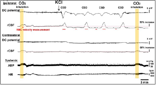 図. マウス脳表におけるCSDの誘発と過灌流および乏灌流(Microcirculation 2018)