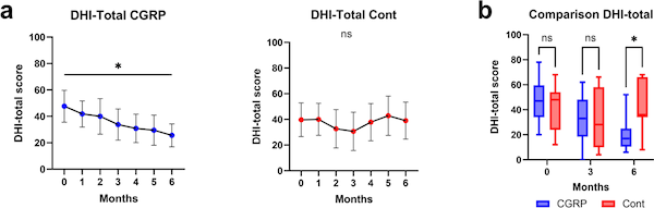 図. めまいの指標(Dizziness Handicap Inventory DHI)は、抗CGRP抗体薬により6か月にわたり低下していった。