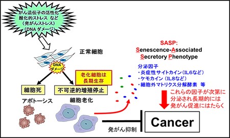 正常な哺乳動物細胞には、異常な細胞の増殖を防ぐための様々な恒常性維持機構が備わっています。このような恒常性維持機構のひとつが、不可逆的細胞増殖停止である「細胞老化」の誘導です。細胞老化はDNAダメージなど発がんの危険性が細胞に生じた場合に発揮される、アポトーシスとならぶ重要ながん抑制機構と考えられています。しかし、アポトーシスとは異なり、細胞老化を起こした細胞はすぐには死滅せず、生体内で長期間生存し続ける可能性があります。最近、細胞老化を起こすと、次第に炎症性サイトカインやケモカイン、細胞外マトリクス分解酵素など、炎症や発がんを促進する様々な因子を分泌するSenescence-associated Secretory Phenotype (SASP) (細胞老化随伴分泌現象)と呼ばれる現象を起こすことが明らかになりました。このことは生体における細胞老化の蓄積が、慢性炎症やがんを進展させる、生体に不利益な微小環境を形成する可能性を示唆しています。当研究室ではこのSASPという現象に着目しSASPが生体内でどのような役割を持つのか、またどのような機構で、多岐に渡るSASP因子が同時に発現上昇するのか、そのメカニズムについても調べています。