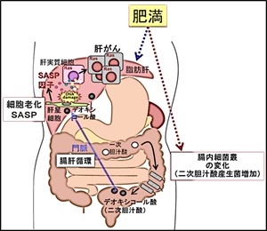 近年、肥満人口は世界中で増加の一途をたどっています。肥満は糖尿病や心筋梗塞のリスクを高めるだけでなく、様々ながんの発症率を高めることが明らかになっています。私たちは、がん細胞周囲に存在しがん細胞を育てやすくするがん微小環境と呼ばれる細胞群や生体内物質の変化に着目して研究しています。最近の私たちの研究成果として、肥満により腸内細菌の構成が大きく変わり、肥満で増えた腸内細菌が産生する物質、デオキシコール酸が肝臓に到達して、組織微小環境を構成する線維芽細胞で細胞老化にともなうSASP(senescence-associated secretory phenotype)という現象が生じ、発がん促進的ながん微小環境に変化する現象を見出しました(Yoshimoto et al. Nature 2013, Loo et al. Cancer Discovery 2017)。この現象は一部のヒトのNASH肝がんでも見られることが明らかになり、臨床研究も行っています。本研究室ではこのマウスモデルを基軸に、肥満誘導性肝がんのさらなる分子メカニズムの解明に迫っていきます。また、このマウスモデル以外にも大腸がん、転移性肝がん等の疾患モデルで、遺伝子改変マウスを用いた個体レベルの実験ならびに分子細胞生物学的アプローチを用いて、がんの発症メカニズムと効果的な発がん予防法の開発を目指しています。