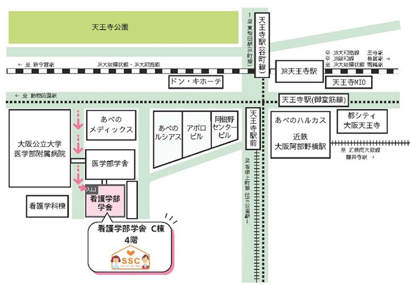 あべのメディックスと大阪公立大学医学部附属病院の間の道を医学部学舎の方向に向かってください。 医学部学舎 三女神像 の前を通りすぎた先が看護学部学舎C棟の入口です。 エレベーターで4階までお越しください。