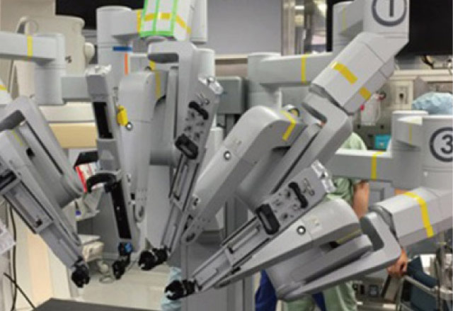 ダヴィンチ(da Vinci Surgical System)は、1990年代に米国で開発され、1999年よりIntuitive Surgical社から販売されています。小さな創から内視鏡カメラとロボットアームを挿入し、医師が3Dモニターを通して術野を目で捉えながら、通常の内視鏡器具ではとうてい不可能な自由で繊細な動きが出来ます。2018年4月から、ロボット手術が保険収載されました。大阪市大では、全国でもいち早くダビンチ手術(da Vinci)を取り入れ2018年6月より開始しております。