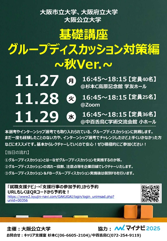 ●申込方法:大阪公立大学「就職支援ナビ」MENU>『行事面談予約』→『支援行事参加予約』→『支援行事を予約する』からご予約ください。