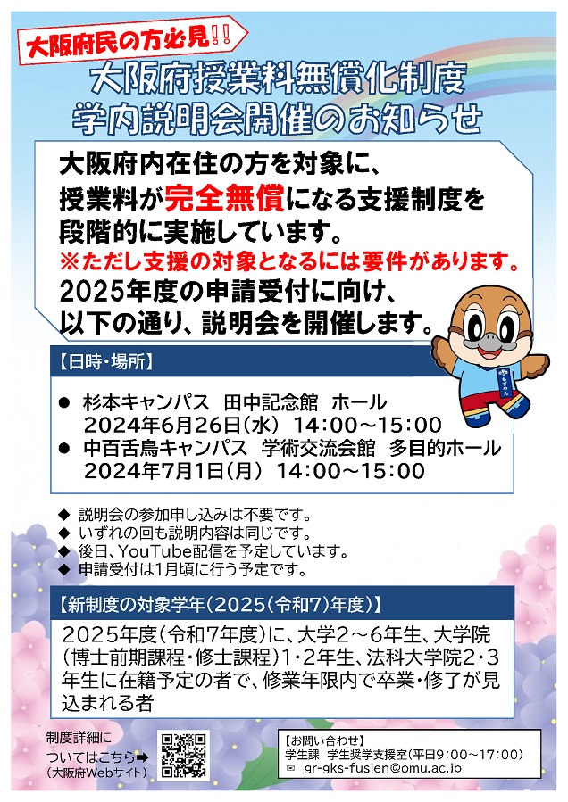 大阪府授業料等無償化制度説明会(6/26,7/1)【学生課 学生奨学支援室】