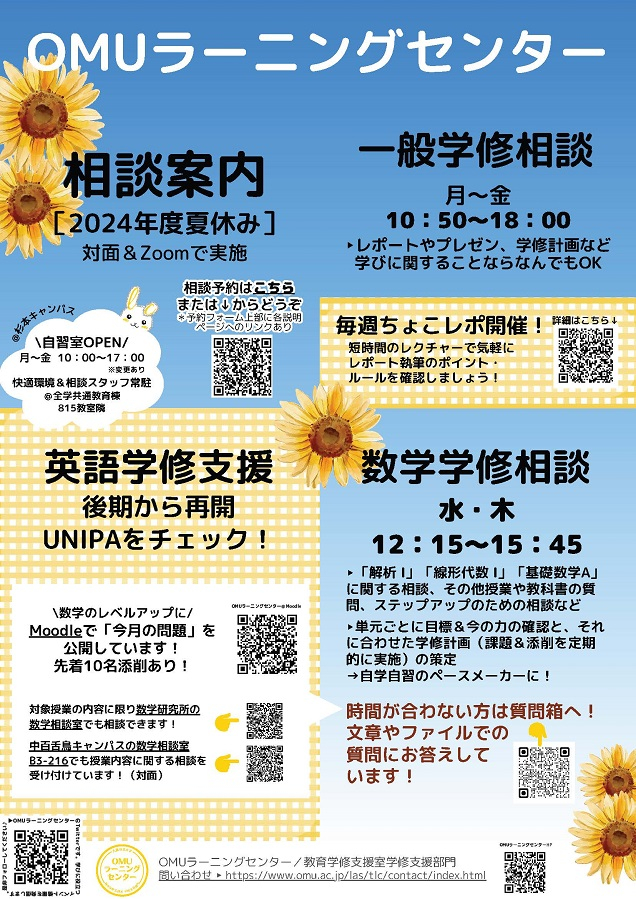 OMUラーニングセンターでは、夏休み中も一般学修相談、数学学修相談を受け付けています。