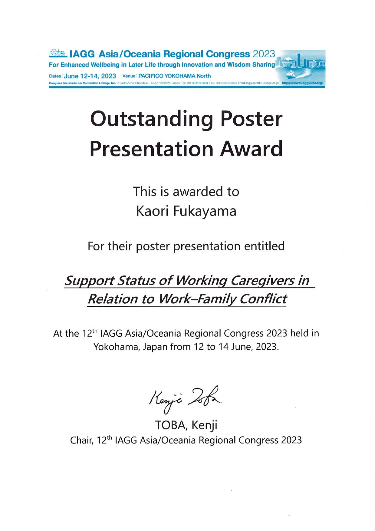 Kaori Fukayama, Ayumi Kono. Support status of working caregivers in relation to work-family conflict. IAGG Asia/Oceania Regional Congress 2023.2023年6月:神奈川.