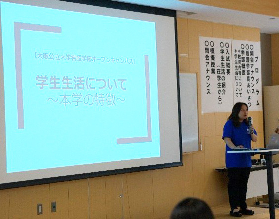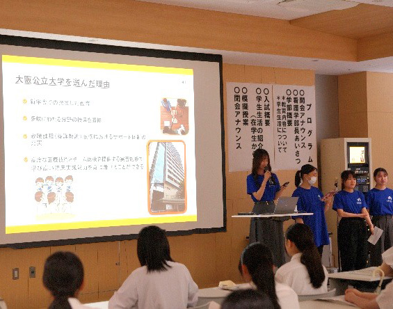 田中看護学部長の挨拶からはじまり、看護学部の教育内容、学生生活や入試概要について説明を行いました。説明会の後半には、看護学部在学生が大阪公立大学に入学した理由や入試準備の実際、看護学部の講義・演習・実習や課外活動等のキャンパスライフについて紹介しました。
