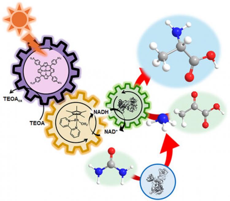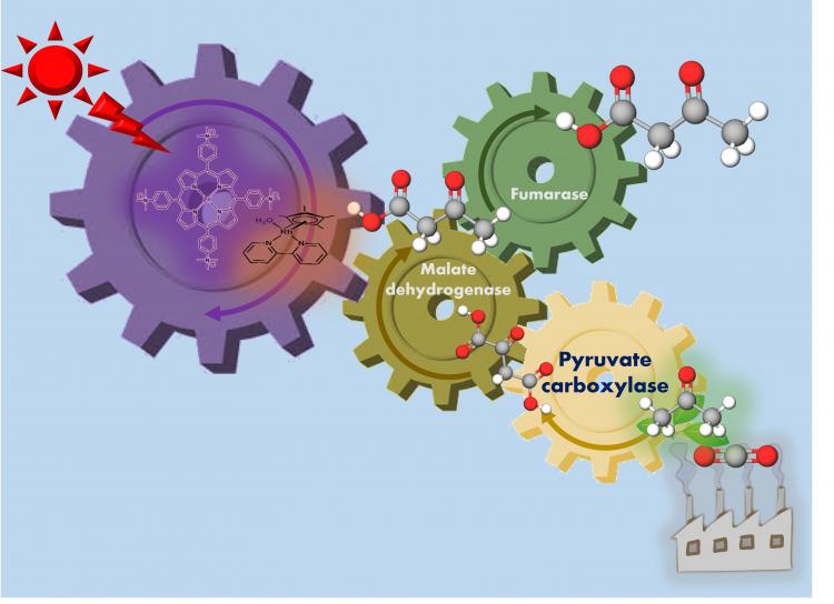 当研究部門では天然の光合成反応を模倣した太陽光エネルギー変換に関する研究を中心に、主に生体触媒・可視光吸収色素・均一触媒からなる複合系による二酸化炭素をプラスチック原材料への変換や水素エネルギーキャリアに関する研究を進めています。 具体的な研究キーワードは「人工光合成」・「二酸化炭素の有価物への変換」・「二酸化炭素の資源化」・「グリーンケミストリー」・「水素エネルギー製造と利用」です。