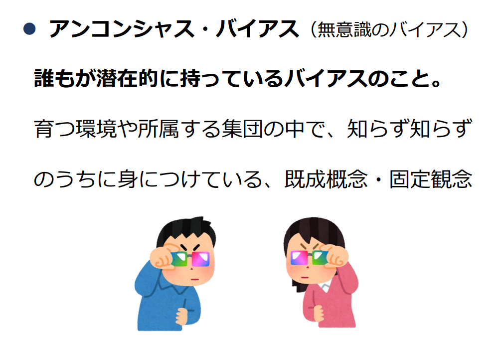 なぜ「バイアス」が注目されるのかについて説明した後、「ステレオタイプ」やジェンダーなどバイアスの元になるものについて考えてから、アンコンシャスバイアスとマイクロアグレッションについてみていきました。