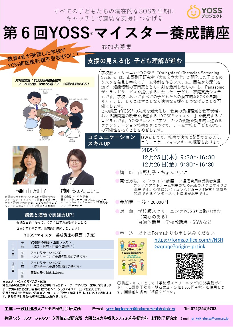 ●講 師:山野則子・ちょんせいこ●参 加 費:一般 20,000円(契約自治体:無料)●対 象: YOSS®に取り組む(関心のある)自治体職員・学校教職員・SSWなど