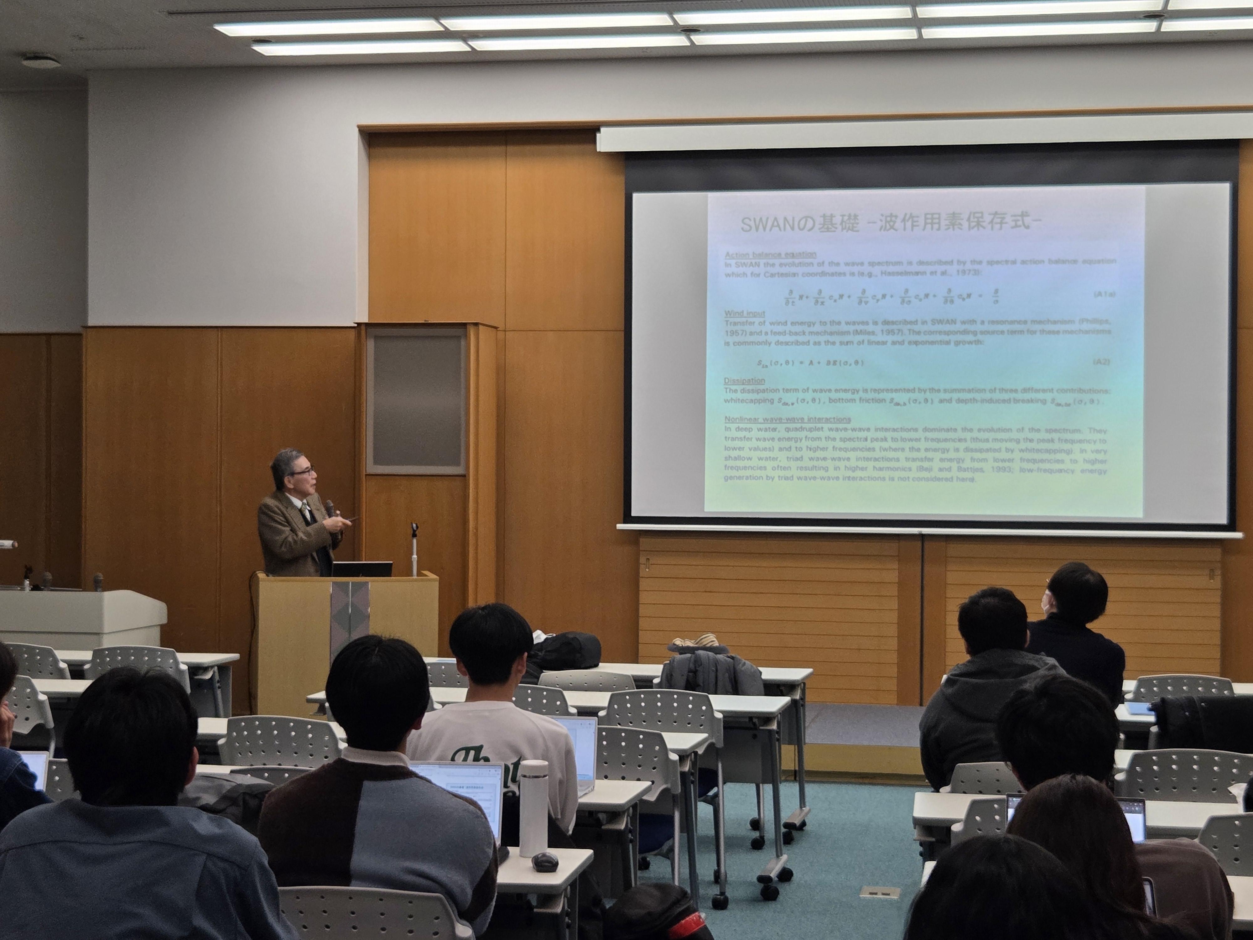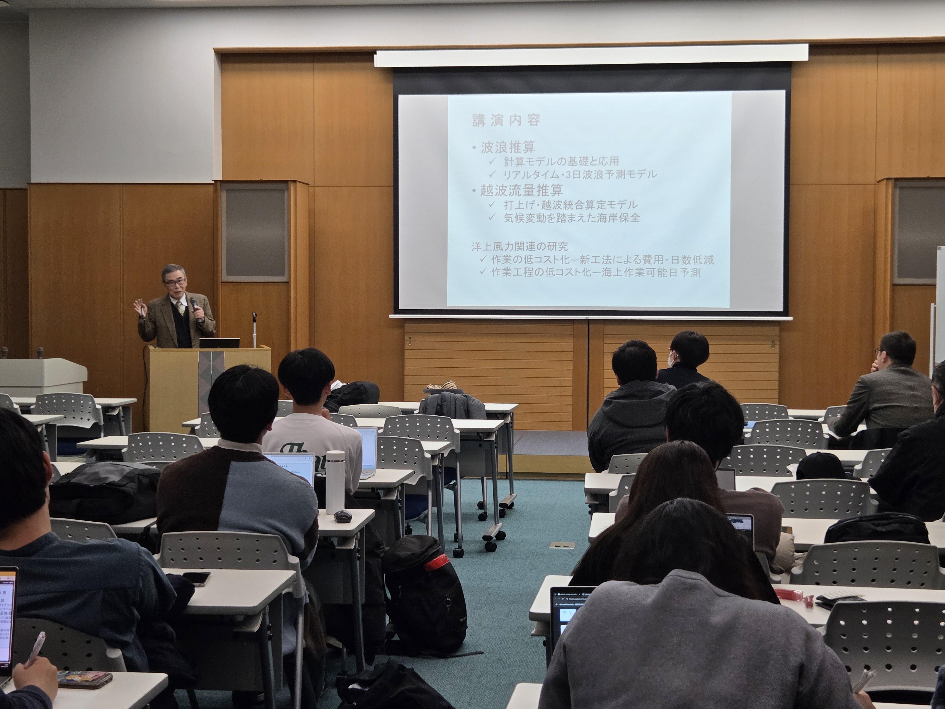 今回は「越波危険度予測システムの要素研究―波浪推算と越波流量推算―」をテーマに、海岸工学・沿岸災害研究の分野で長年にわたり第一線で研究と教育に携わってこられた間瀬 肇氏(京都大学名誉教授)を講師にお迎えしました。講演では、台風時などに沿岸部で発生する高波や越波現象を対象として、波浪推算に関する計算モデルの基礎とその応用、リアルタイムおよび3日先を見据えた波浪予測モデルについて解説が行われました。あわせて、越波流量推算に関しては、打上げと越波を統合的に評価する算定モデルや、気候変動を踏まえた今後の海岸保全のあり方について紹介され、沿岸防災における数値解析の重要性が示されました。当日は、河海工学を履修する学生を含む参加者が集まり、沿岸防災に関する専門的な研究内容に触れる機会となりました。