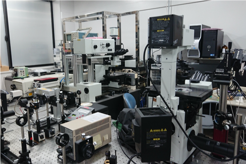 顕微鏡下において蛍光スペクトル測定、蛍光イメージング測定が可能。単一分子蛍光計測、溶液中蛍光分子の蛍光相関分光測定も可能。