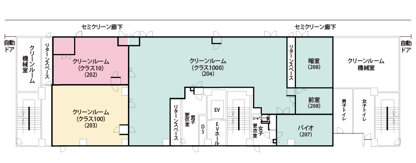 クラス10、クラス100、クラス1000(前室、暗室、バイオクリーンルーム含む)、CR 準備室(打ち合わせスペース)