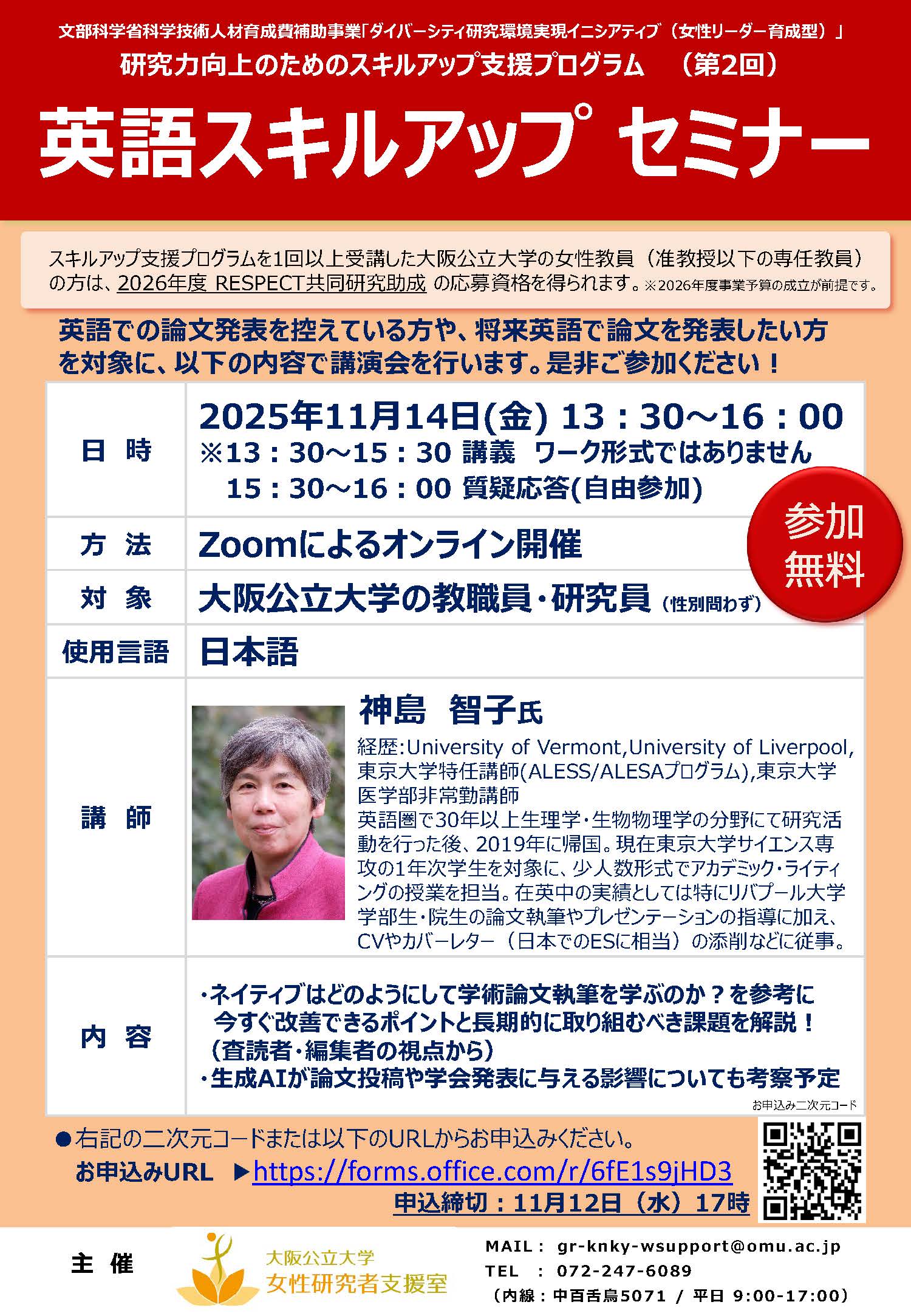 ※スキルアップ支援プログラムを1回以上受講した大阪公立大学の女性教員(准教授以下の専任教員)の方は、 2026年度 RESPECT共同研究助成 の応募資格を得られます。 (2026年度事業予算の成立が前提です。)