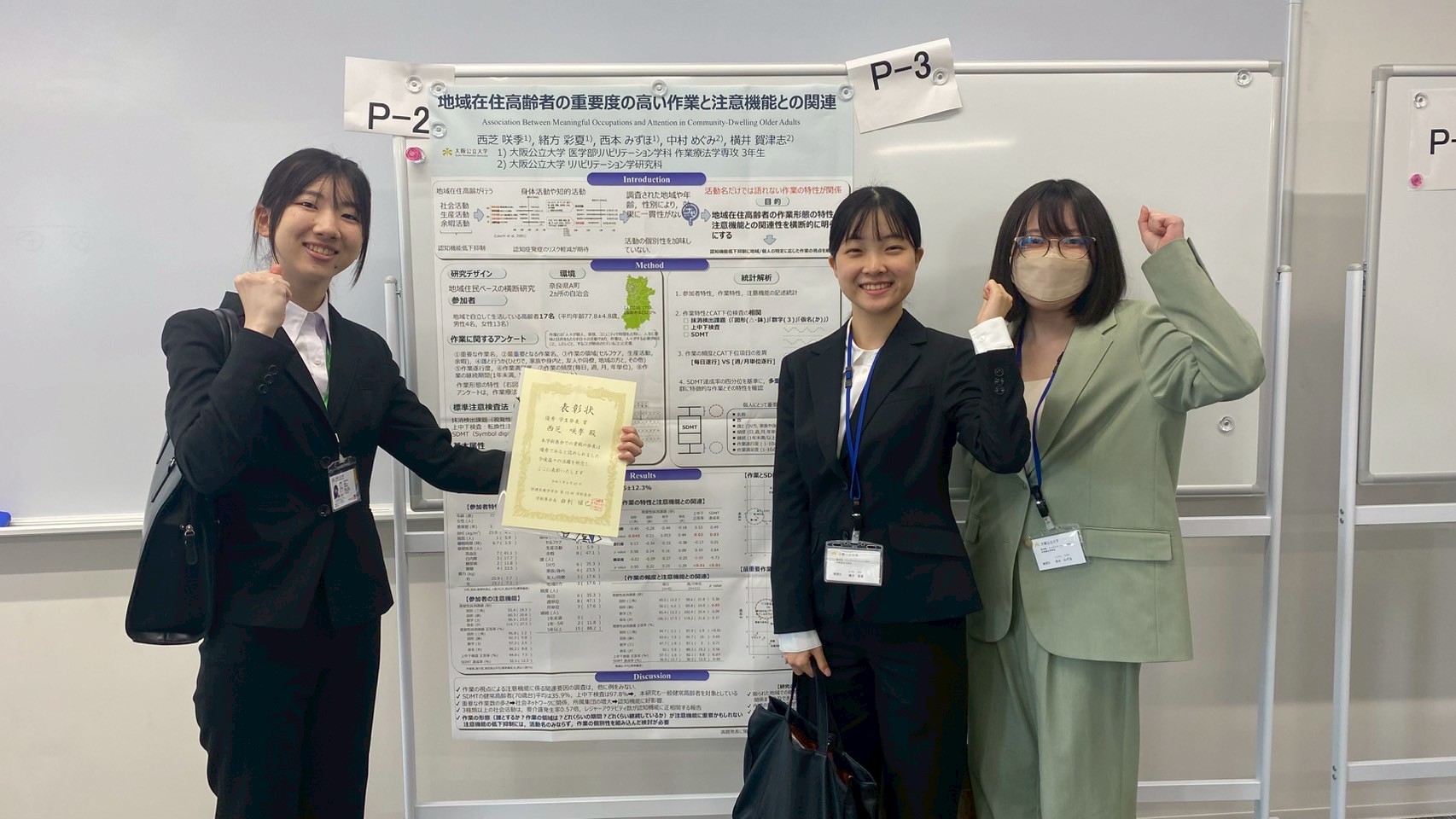 2025年9月27日(土)に森ノ宮医療大学で開催された「第15回保健医療学学会」において、作業療法学専攻3年生の西芝咲季さん、緒方彩夏さん、西本みずほさんが「優秀学生発表賞」を受賞しました。