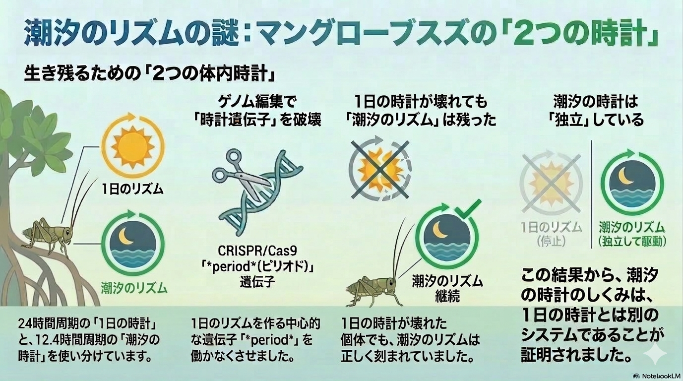 - 潮間帯に生息するコオロギであるマングローブスズは,潮の満ち引きに対応した約12.4時間周期の時計~概潮汐時計~を持っています.この概潮汐時計の分子機構はこれまで不明でした.今回私たちはゲノム編集技術を用いて,概日時計遺伝子periodが概潮汐時計に関わらないことを示しました.昆虫の概潮汐時計は,概日時計とは全く異なるしくみでできているようです.宮野里菜さんが博士前期課程在籍中に,また,清水悠太さんが後期博士課程在籍中に行った成果です.