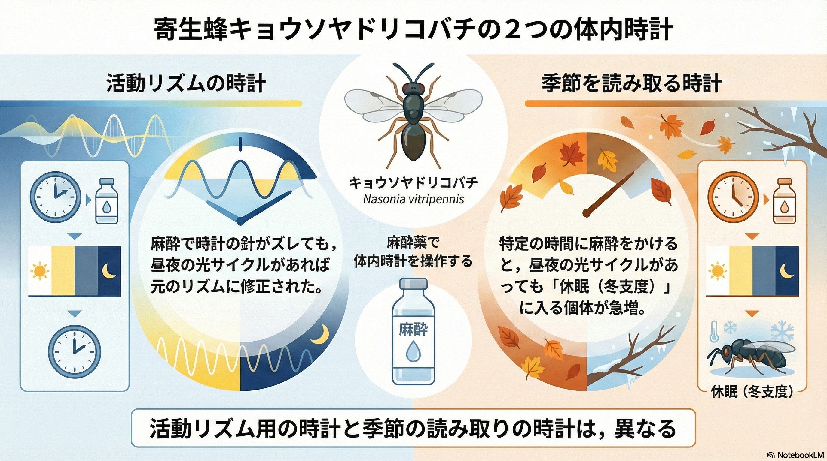 - キョウソヤドリコバチを対象に,概日時計と光周性の関係を調べた研究です.昆虫では,「歩行活動を制御する時計」と「光周性にかかわる時計」が同一か否かについて,長年議論が続いてきました.本研究では,イソフルランによる麻酔処理が歩行活動リズムと光周反応に及ぼす影響を比較することで,これらふたつの時計機構が機能的に分化している可能性を示しました.特任助教の向井歩さんが,博士後期課程から温めてきた成果です.インフォグラフィクス拡大版はこちら.