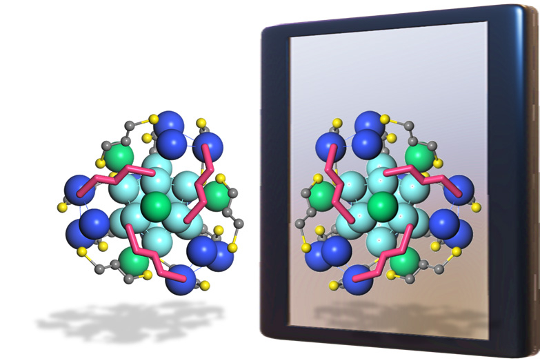 銀29クラスターは、二座配位子として1,3-ベンゼンジチオール(BDT)や水溶性のα-ジヒドロリポ酸(DHLA)を用いることで合成されます。BDTはキラリティーを有していませんが、右巻き・左巻きの非対称構造のクラスターを等量混合物(ラセミ体)を与えます(右図)。私たちは、この非対称構造の存在に気づき、キラルカラムによる各エナンチオマークラスターの分離に成功しました。一方、DHLAは水溶性の二座配位子ですが、キラリティーを有しています。BDTに変えて、DHLAを用いて水溶液中で合成した銀29クラスターは、DHLAのキラリティーに依存して、右巻きまたは左巻きの構造を優先的に与えます。また、銀29クラスターは発光性を有しており、非対称構造を制御したクラスターは、吸収円二色性(CD)に加えて、円偏光発光(CPL)を示しました。さらに、合成温度、濃度、添加物などの条件により、銀29クラスターの非対称構造が自在に制御できることを見出しています。