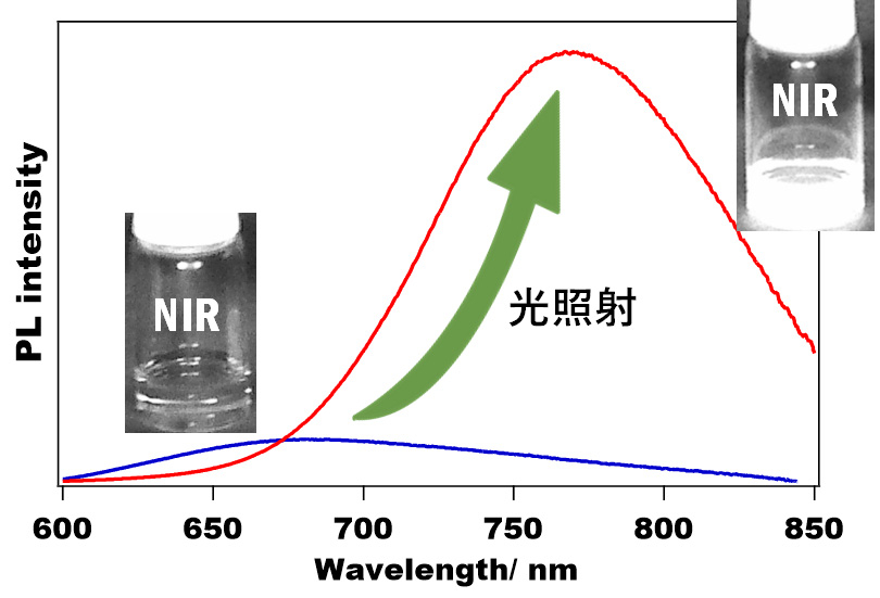 貴金属クラスターは、離散したエネルギー準位を有する軌道間の電子遷移に基づく光学特性(吸収・発光)を示します。特に銀原子を含むクラスターはしばしば良好な発光を示すことがあります。BDTを配位子として有する銀29クラスターはDMFによく分散し、赤色(~660 nm)の発光を示すことが報告されていました。私たちは、この銀29クラスターをピリジン中に分散し、さらに、光照射を行うことで、発光波長は近赤外域(~770 nm)まで長波長シフトし、発光量子収率が1%から30%以上に向上することを見出しました。さらに、クラスターの銀原子の一部を金原子に変えた金ドープクラスターは発光ピーク800 nm以上、発光量子収率45%以上と、分子・錯体・クラスター材料としては、過去最高強度の近赤外発光を示すことを報告しました。