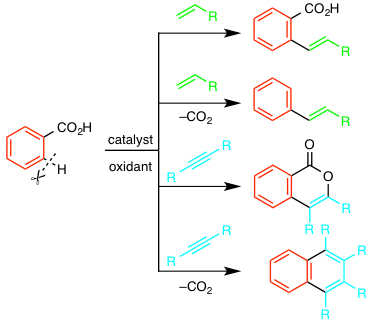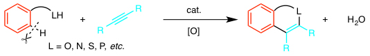Recently, oxygen, nitrogen, and other heteroatom-containing substituents (–LH) have been found to act as directing groups to induce chelation-assisted C–H bond cleavage. They allow smooth coupling at the neighboring position. Especially in the coupling with alkynes, a variety of fused heterocyclic compounds can be constructed in a single step.