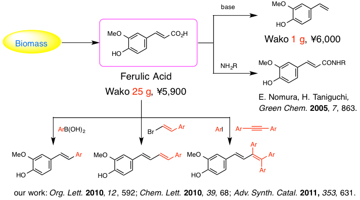 Fossil resources including petroleum, coal, and natural gas are currently predominant raw materials for the production of chemicals in modern society. However, in the near future, we have to develop the chemicals feeding system based on renewable resources such as biomass. The change of feedstock requires new organic synthetic methods. We now focus on carboxylic acids as readily available building blocks from biomass. A number of new reactions enabling the efficient transformation of carboxylic acids to various functionalized molecules have been developed by our group.