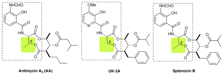 Microbial species have a capability to produce a wide variety of bioactive compounds with novel structures and various biological activities. Since UK-2A, an antimycin class antibiotic, was first isolated in 1996 from a soil sample collected at Sugimoto campus, we have been engaged in studies toward synthesis and biological evaluation of di/tri/tetra lactone antibiotics. 1) Splenocins were isolated from organic extract of marine-derived Streptomyces strain CNQ431 as potent anti-inflammatory antibiotics in 2009, which displayed low nanomolar activity in the suppression of cytokine production by OVA stimulated splenocytes. The structures of splenocins are similar to those of antimycin A3 and UK-2A.