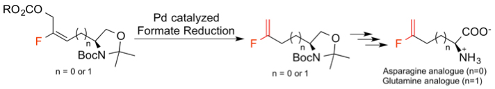 The ability of fluorine to impart unique properties to organic molecules has been exploited in the design of fluorine-containing bioactive compounds. Functionalized fluoroolefins are particularly important, with current applications in the synthesis of biologically active materials such as peptide isosteres. In our continuing studies on synthetic organofluorine chemistry towards fluorinated biomimetics, we have been interested in replacement of side-chain amide moieties of asparagine and glutamine with fluoroolefins, which are proposed to be aprotic mimic for amides due to their electronic properties. Asparagine and glutamine residues play important structural roles in proteins because their side-chain amide groups could act as both hydrogen bond acceptors and donors. We have developed a new access to fluorine-containg asparagine and glutamine analogues via formate reduction.