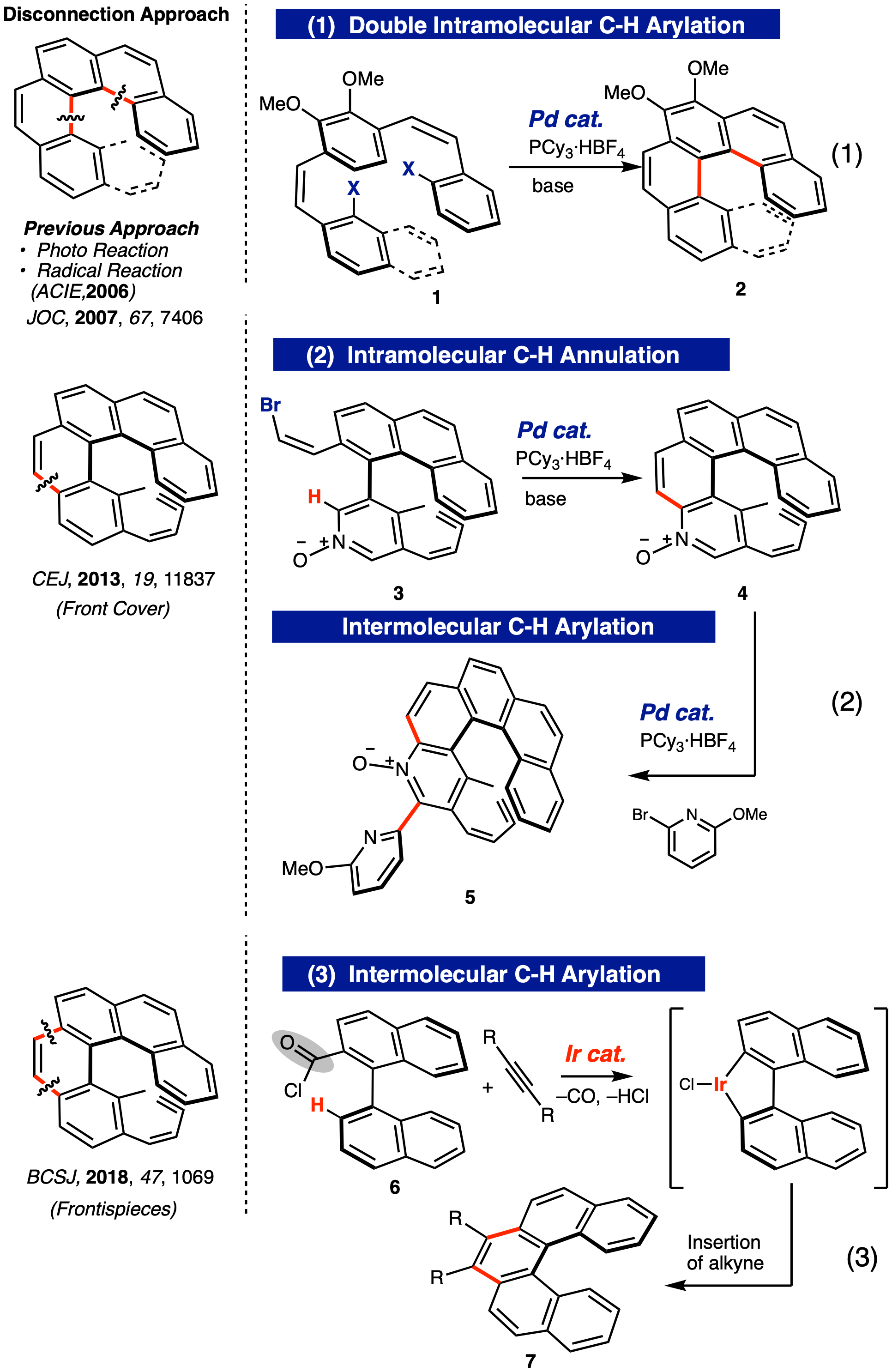 ヘリセン合成において最もねじれる中央の芳香環をどのように構築するかは重要な点である。我々は、ビアリール誘導体 3 の側鎖に導入したZ-ブロモビニル基を活用して、Pd触媒分子内 C–H アリール化反応により対応するアザヘリセンオキシド 4を効率よく合成する方法論を確立した(式 2)。さらに、N-オキシドのもう一方のオルト位 C-H 結合にも、Pd 触媒分子間 C–H アリール化反応により新たにアリール基を導入することに成功し、有機触媒に潜在的に利用可能なキラルヘリセン誘導体 5 の合成を達成した (CEJ, 2013, 19, 11837, Front Cover)。