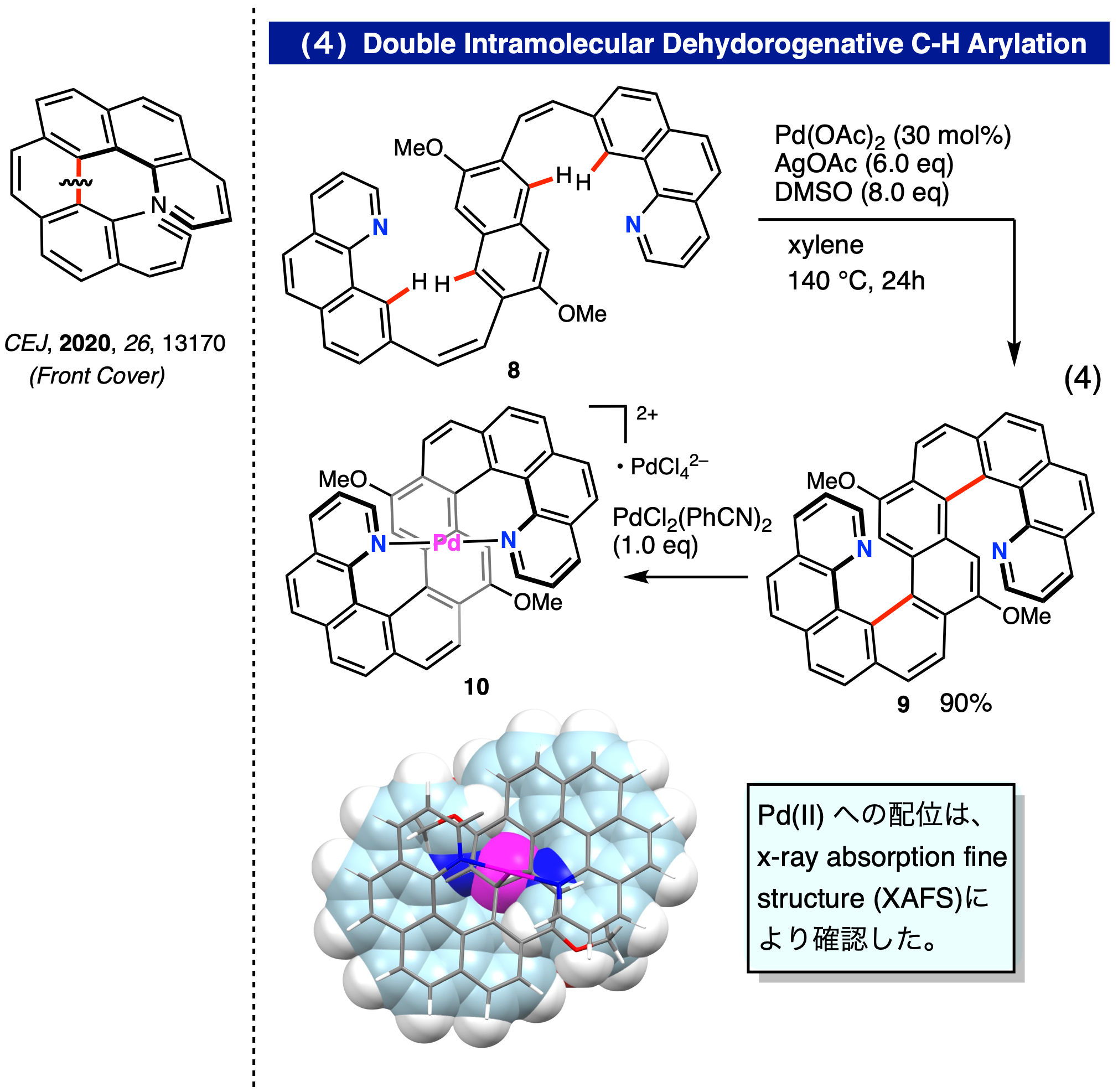 これまで基質にハロゲンなどの活性基の導入を必要としたが、ハロゲン導入を必要としない脱水素型ダブル C–H アリール化反応を行うことでS字型ジアザヘリセン 9 の合成を達成した(式 4)。一般に収率が著しく低下する高次ヘリセン合成では前例にない高収率 (90%) にてdl体 9を選択的に合成することができた。また、得られた 9 はヘリセン内縁部に2つの配位性窒素原子を持つため、トランスキレート型配位子として活用できることが期待された。実際に、S字型ジアザヘリセンとPdCl2(PhCN)2とを混合すると瞬時に Pd 錯体 10 が生成し、2つの窒素原子が Pd に対してトランス位で配位していることを x-ray absorption fine structure (XAFS) を用いて確認することに成功した。ジアザヘリセンをトランスキレート型二座配位子として活用できることを示した最初の例である (CEJ, 2020, 26, 13170, Front Cover)。