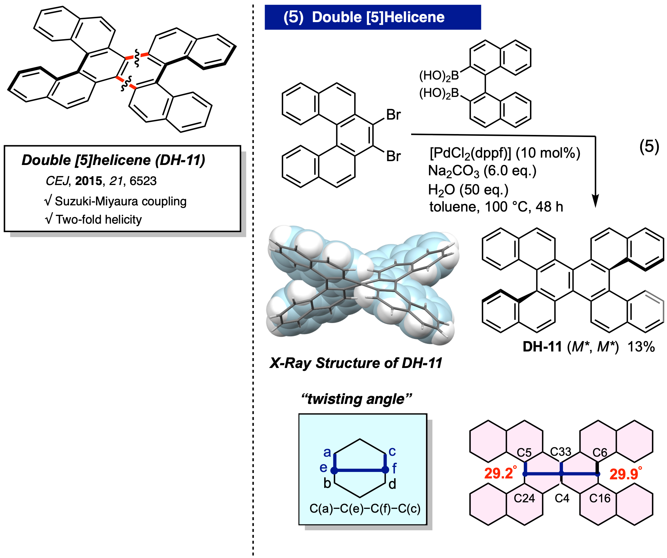 7,8-ジブロモ[5]ヘリセンとビナフチルビスホウ酸とのダブル鈴木―宮浦カップリング反応により、dl体のダブルヘリセン (DH-11) を選択的に合成することに成功した。この際に、X線結晶解析の結果から中央のナフタレンコアにおけるベンゼン環のねじれ角 (twisting angle: 次ページの図を参照) が最大で 29.9°になることを明らかにした。単独の [5]ヘリセンのそれが 13.7°であることから、多重ヘリセン化することで複数の立体的なひずみが中心部の芳香環に集中し、大きく湾曲した構造をとることを明らかにした (CEJ, 2015, 21, 6523)。