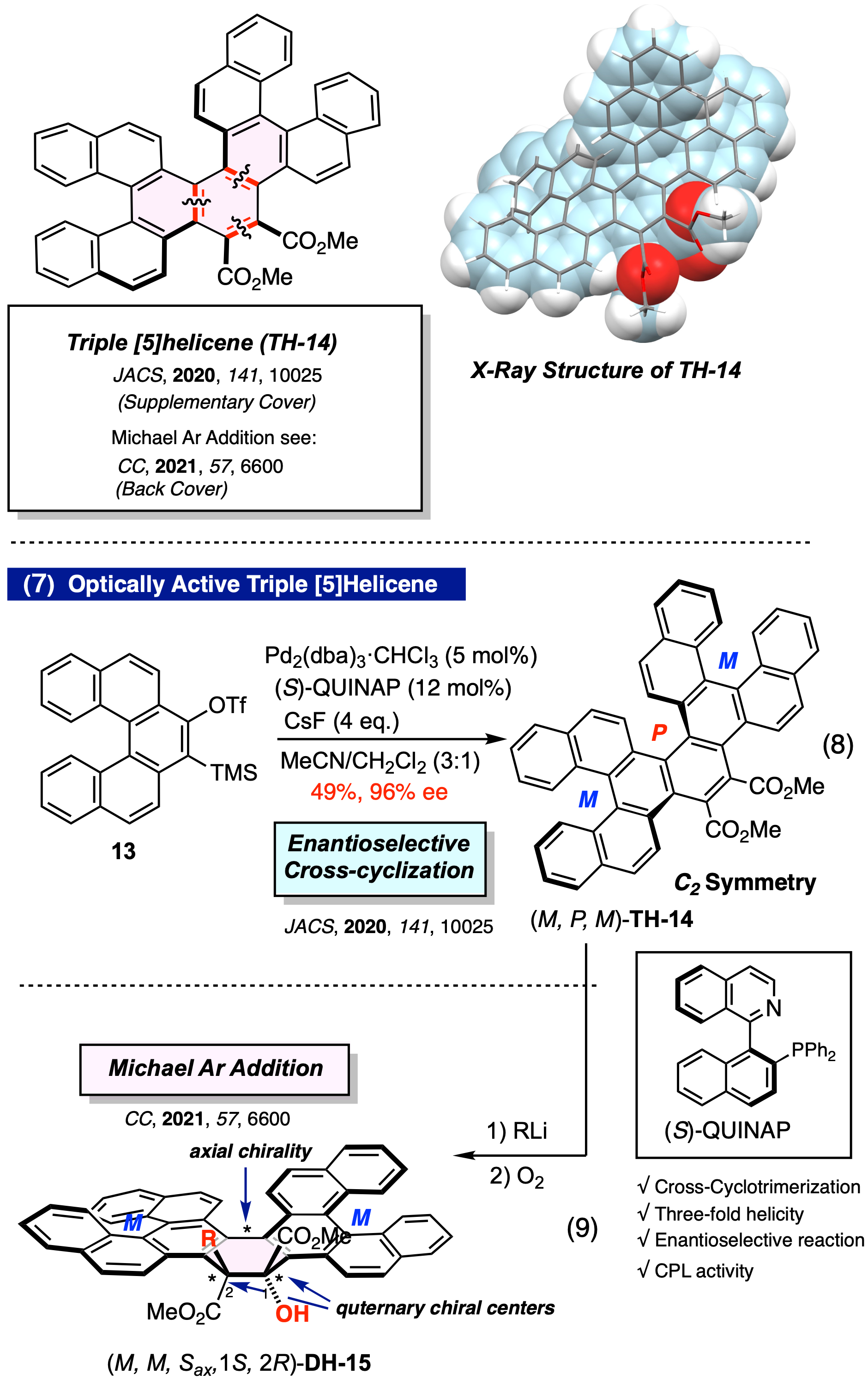 これまでに合成された光学的に純粋な多重ヘリセンのほとんどは、Scholl反応などの酸化的カップリング反応後に、キラル固定相を用いた光学分割によって調製されていた。我々は、ヘリセニルアライン前駆体 13 とアセチレンジカルボン酸ジメチルとのPd触媒を用いた不斉交差 [2+2+2] 環化三量化反応による三重ヘリセンの合成を検討し、(S)-QUINAP を用いたときに収率 49%、エナンチオ選択性 96% ee で三重ヘリセン (TH-14) を光学活性体として得ることに成功した (文献4, JACS, 2020, 141, 10025)(式 8)。また、実験的、理論化学的考察を行った結果、本反応は動的速度論的分割を経て立体選択的に進行していることが明らかとなった。また、(M, P, M)-TH-14は高いCPL特性 (glum = –2.4 × 10−3 @ 421 nm) を示すことを明らかにした。
