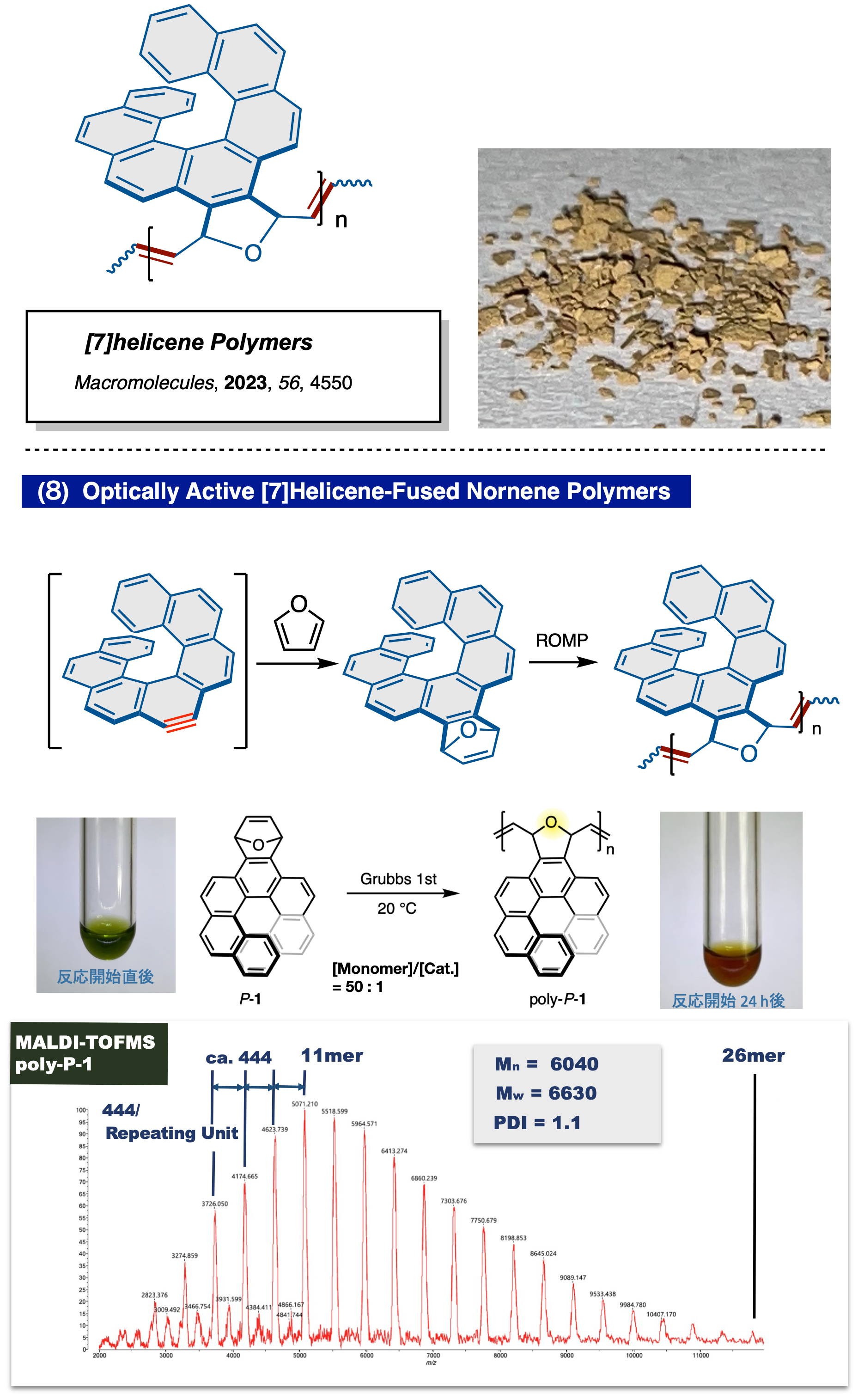1,4-ジヒドロ-1,4-エポキシ [7] ヘリセンの開環メタセシス重合 (ROMP) を活用したポリ [7] ヘリセンの合成を行った。2,7-ジヒドロキシフェナントレンを出発物質として、9,10 位に ブロモ基を有する [7] ヘリセン誘導体を合成し、塩基存在下でアラインを発生させるとともにフランとのDiels-Alder反応を行い、モノマーを得た。次に、光学分割によりモノマーを光学活性体とし、さらにGrubbs 1st触媒による開環メタセシス重合反応 (ROMP) を行った。MALDI-TOFMSにて質量分析を行ったところ、モノマーの分子量に相当する分子イオンピークが規則的に増加するスペクトルを観測した。このことからROMP により重合し、最大で26量体となる光学活性ポリ[7]ヘリセンが得られていることを確認した (Macromolecules, 2023, 56, 4550)。