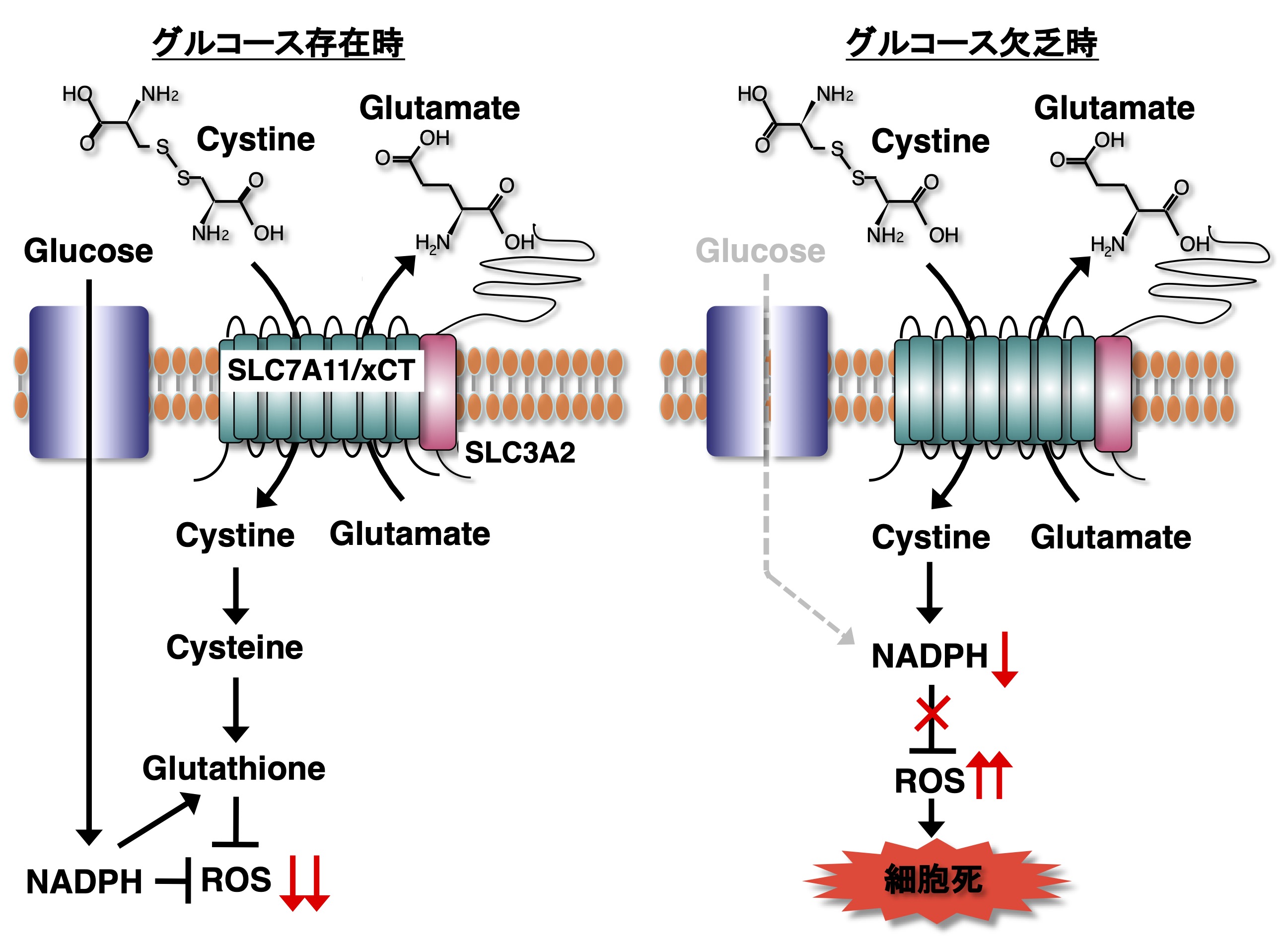 がん細胞では、代謝経路の使い方が正常な細胞と比べて大きく異なることが知られています。それに伴って、様々な代謝に関わる酵素やトランスポーターの発現が、がん細胞では非常に上昇している例が数多く報告されています。特にがん細胞ではグルコースに対する依存性が高く、周りの環境からグルコースが欠乏するとすぐに細胞死を引き起こすことが知られています。私たちの研究グループは、神経膠芽腫細胞において発現が上昇しているSLC7A11 (xCT) によるシスチンの取り込みが、グルコース欠乏による細胞死に深く関わっていることを新たに見出しました。アミノ酸トランスポーターSLC7A11は、細胞膜においてSLC3A2 (CD98, 4F2hc) と複合体を形成し、2分子のシステインが結合したシスチンを細胞外から取り込んで、グルタミン酸を細胞外へ放出する交換輸送を行います。SLC7A11は、神経膠芽腫を含め、様々ながん細胞において発現が上昇していることが報告されており、取り込まれたシスチンがグルタチオンの産生に利用されることで、がん細胞は過度な酸化ストレスから回避していることが知られています。最近、私たちが新たに見出したグルコース欠乏による新しいタイプの細胞死が、"Disulfidptosis(ジスルフィドトーシス)"と名付けられ、注目されています。今後は、この新しいタイプの細胞死がどのように制御されているかより詳細に明らかにすることで、がんの新たな診断法や治療法の開発につながる新しい発見を目指していきたいと考えています。