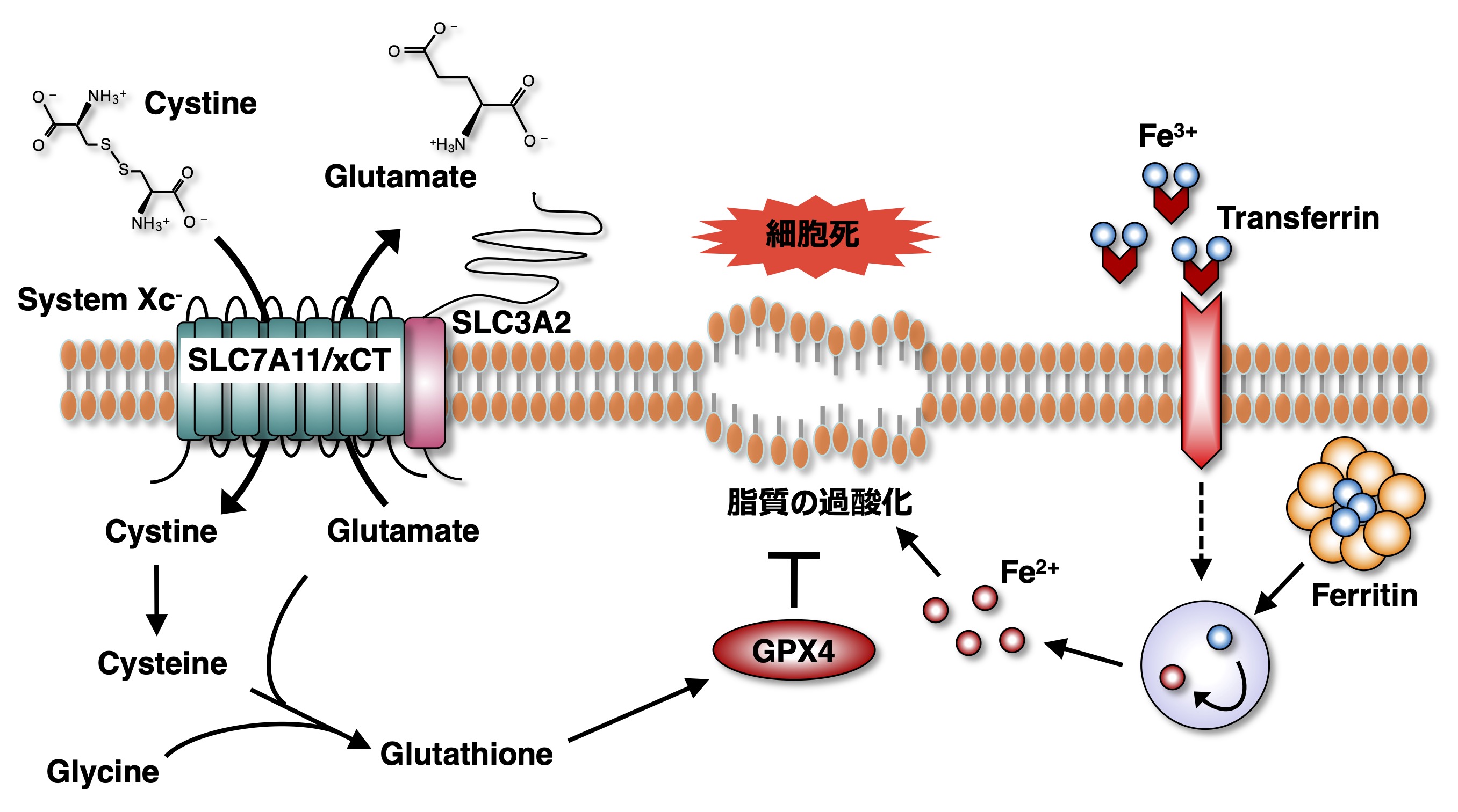 フェロトーシスは、鉄イオン(Fe2+)依存的に過度に酸化された脂質が蓄積することによって引き起こされる細胞死です。特にがん細胞では、細胞外からのシスチンの取り込みが阻害されることで、細胞内の還元型グルタチオンレベルが低下し、それに伴って脂質の過酸化を直接抑制している Glutathione Peroxidase 4 (GPX4) の活性の低下、同時に鉄イオンが誘導されることで細胞膜脂質の過酸化が促進し、フェロトーシスが引き起こされることが知られています。私たちの研究グループは、がん細胞においてどのようなメカニズムでフェロトーシスが誘導され制御されているのかについて分子レベルで明らかにし、がん細胞に対する効果的な治療法の開発に貢献することを目指しています。