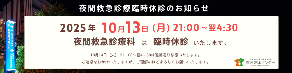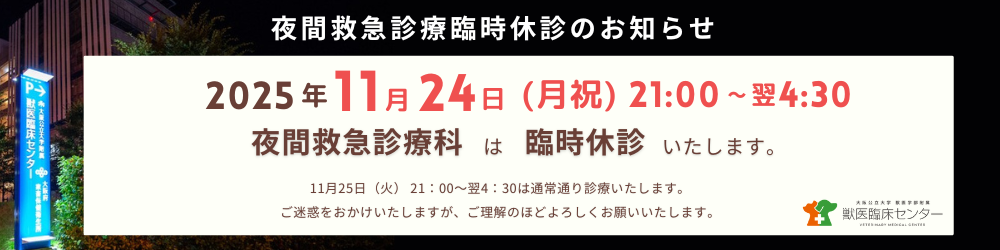 出勤する獣医師の専門性によって診察可能な場合もありますが、対応不可能なことがありますことをご了承ください。また、必ず当日に診療が可能かどうかを直接電話でお問い合わせいただけますようお願い申し上げます。(夜間専用受付:072-463-5939)
